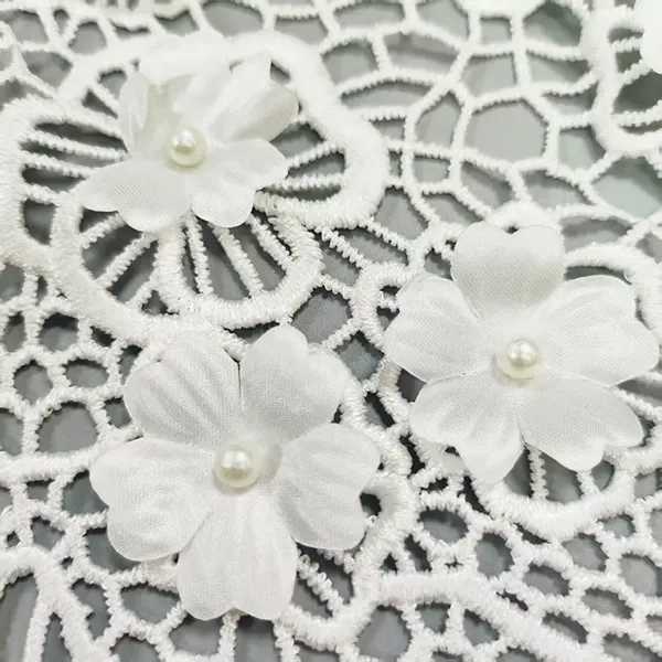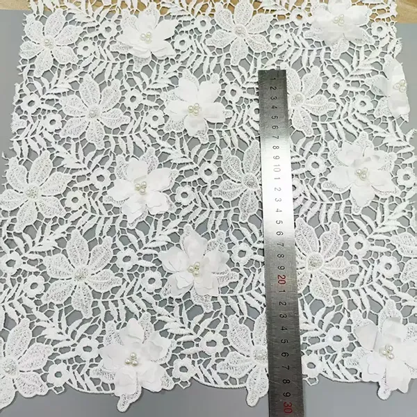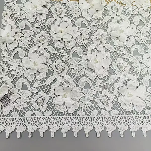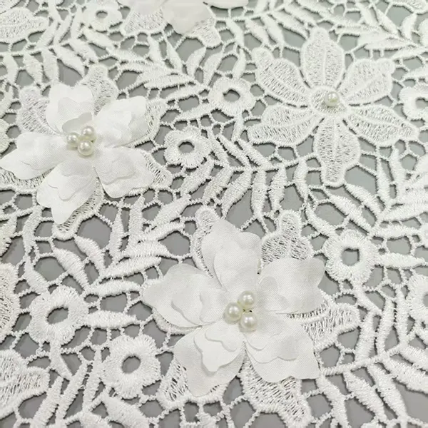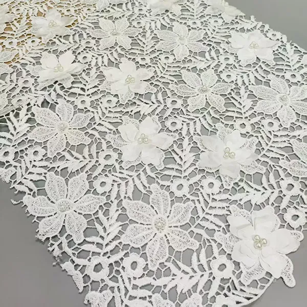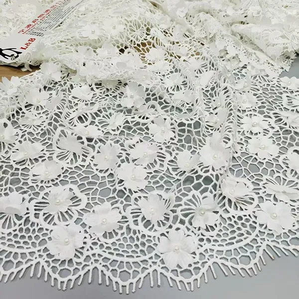 3D çiçəkli krujeva guipure Suda həll olunan kordon naxışlı texnikalardan istifadə edərək hazırlanmış dizayn, heykəltəraşlıq keyfiyyəti olan dəqiq, krujeva kimi nümunələri göstərir. Parça yüksək səviyyəli moda, gəlin geyimi və dekorativ tətbiqlər üçün idealdır, zəriflik və toxuma təklif edir.