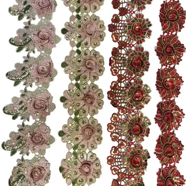 Dəbli yüksək keyfiyyətli qısa üç ölçülü çiçəkli sequin krujeva və digər aksesuarlar üçün uyğun, böyüyən sequins ilə bəzədilmiş, gelinlik və aksesuarlara lüks əlavə etmək üçün mükəmməldir. Qısa uzunluqlu bəzək boyunbağı, qollar, debriyajlar və daha çox üçün çox yönlüdür. Davamlı, zərif materiallardan hazırlanmış, axşam paltarları, örtüklər və DIY moda layihələrini artırır. Dizaynerlər üçün idealdır. Xüsusi üslub üçün çox rəngdə mövcuddur