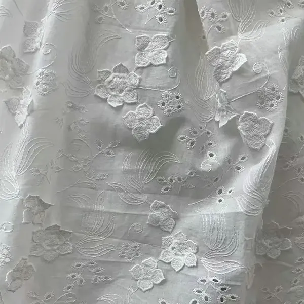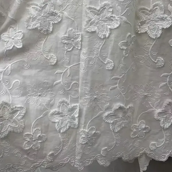 3D çiçəyi bəzədilmiş 100% pambıq naxışlı krujeva krujeva çuxuru olan 3D çiçəkli naxış və zərif göz qapaqları kəsmə işləri, bu 100% pambıq krujevalı, gəlin geyimi, geyimlər və bluzlar üçün nəfəs alan zəriflik təklif edir. Ölçü dizaynları yumşaqlıq və drape saxlayarkən lüks bir toxuma yaradır. Romantik, vintage-dan ilhamlanmış moda üçün mükəmməldir.