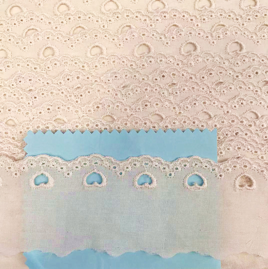 Dalğalı kənarları olan ağ floret pambığı təmiz pambıqdan hazırlanmış krujeva trim, onu yumşaq, nəfəs alan və təbii hala gətirərək, dalğalı kənarları olan üçölçülü kiçik çiçəklər var. Uşaq geyimləri, qadın geyimləri, məişət əşyaları və s. Dekorasiya üçün uygundur, ekoloji cəhətdən təmiz və dəri ilə işləyən, maşın yuyulur və çox genişlik variantları təklif edir. Özelleştirme dəstəklənir.