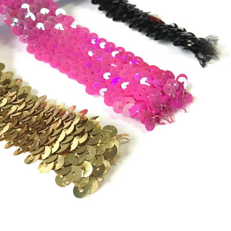 Fərqli genişlikli bling bitirmə Braid Elastik Sequin Krujeva Trim çox genişlikdə mövcuddur, parlaq sequins ilə birləşdirilmiş elastik bir baza, parlaq bir parıltı verir. Mərhələ geyimləri, axşam xalatları və ayaqqabı və şapka bəzəkləri üçün uyğundur